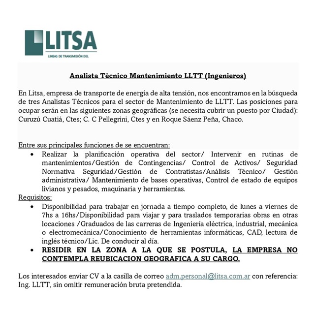 Analista Técnico Mantenimiento LLTT (Ingenieros) para Curuzú Cuatiá (Ctes.), C.C.Pellegrini (Ctes.) y Roque Sáenz Peña (Chaco).