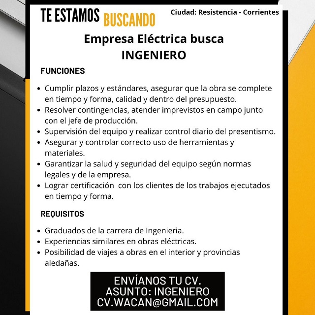 [Resistencia / Corrientes Capital] Empresa eléctrica busca INGENIERO con experiencia en obras eléctricas