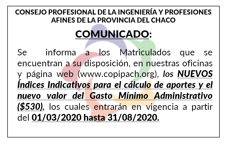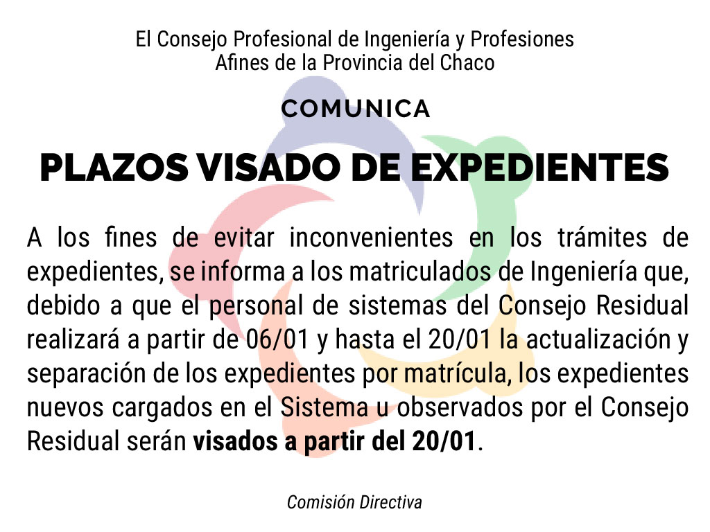 Debido a los trabajos de migración de los datos correspondientes al CPAAICH hacia el COPIPACH, el visado de expedientes se realizará a partir del 20 de Enero de 2020.