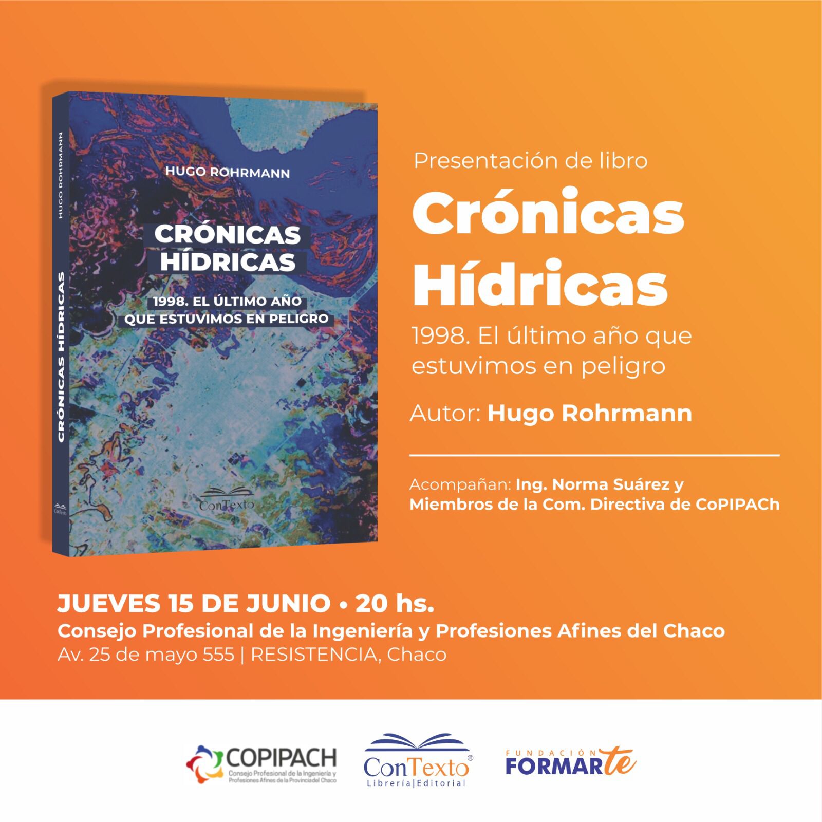 En el marco del mes de la Ingeniería, el día Jueves 15/06, a las 20 hs, en nuestra Sede, se realizará la presentación del Libro del Ingeniero Hugo Rohrmann «Crónicas Hídricas». Invitamos a nuestros matriculados y al público en general.